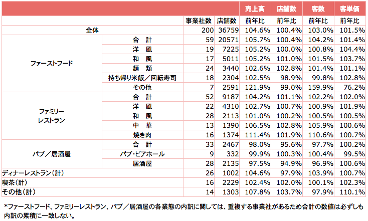 業態別概況では、ファーストフード業態の全体売上げが105.7%と前年を上回った 。 「洋風」は各社まちまちであったが、ディナータイムに追加料金で定番商品が増量されるキャンペーン等が好調で客単価が上昇、売上げは105.2%であった。