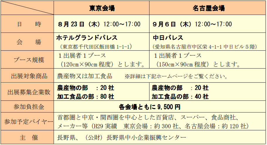 第6回「おいしい信州ふーど」発掘商談会 東京会場・名古屋会場の出展者を募集に! 農産物や加工食品を8月23日、9月20日開催 |