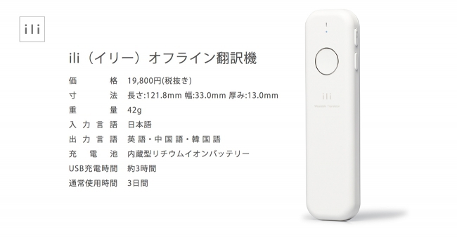 ili(イリー)は、旅行者の使いやすさに特化したウェアラブル音声翻訳機です。インターネット不要、最速0.2秒で即座に翻訳し、相手を待たせることなくスムーズに伝える事が可能だ。