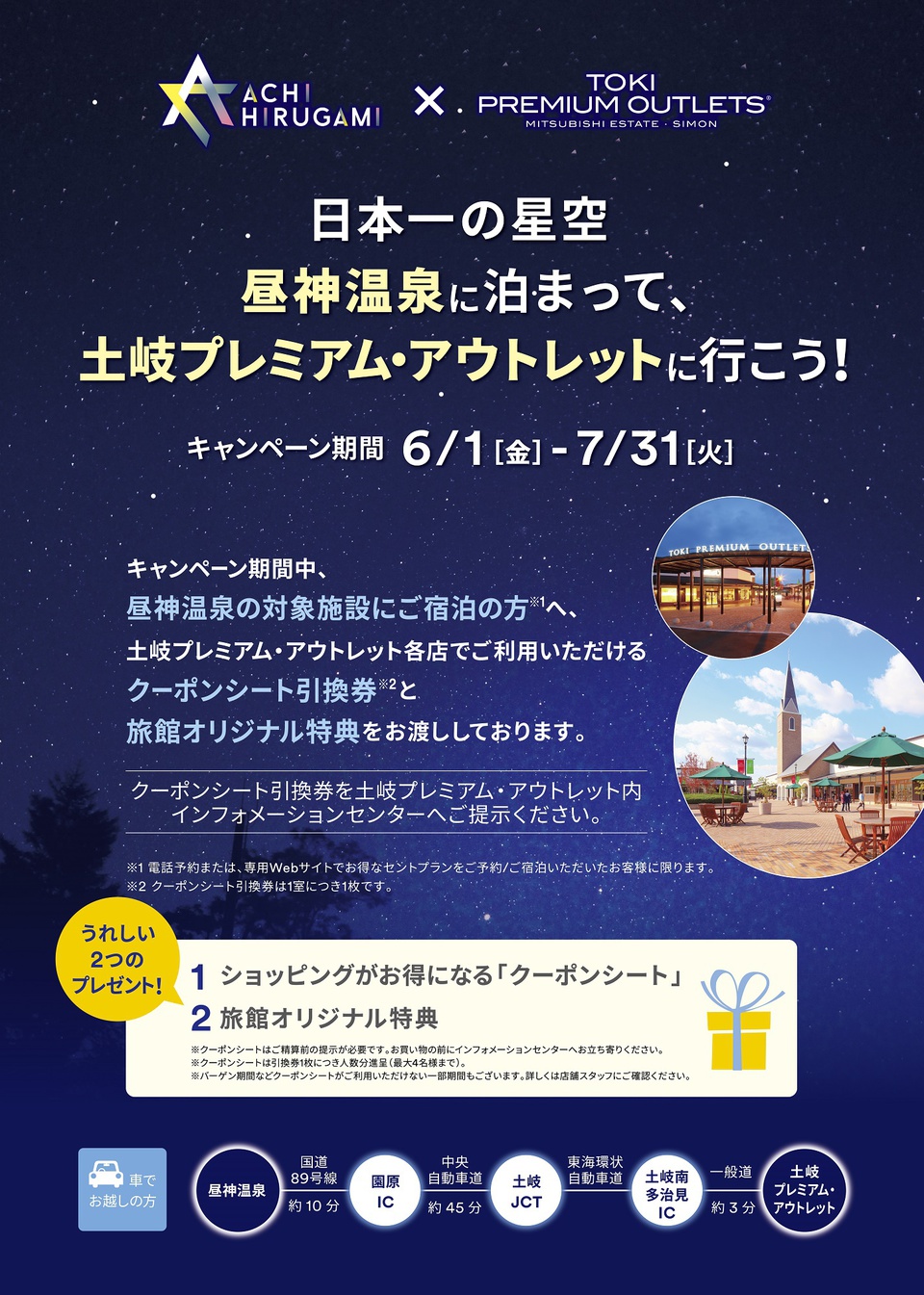 【日本一の星空 昼神温泉に泊まって、土岐プレミアム・アウトレットに行こう!】キャンペーン概要