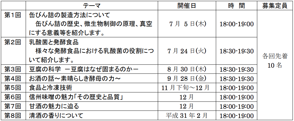また第3回以降についてはその都度プレスリリース等でご案内するので、確認いただき、申し込みをする。問い合わせ、申込先(〒380-0921 長野市大字栗田字西番場 205-1 長野県工業技術総合センター食品技術部門 担当 戸井田仁一まで(電話026-227-3131 FAX026-227-3130 E-mail: shokuhinshiken@pref.nagano.lg.jp)。