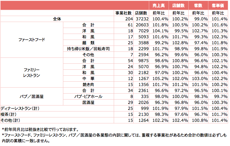 パブ•居酒屋業態では、「パブ•ビアホール」は順次オープンしたビアガーデンが予想外の気温で苦戦、売上げ」は98.0%。「居酒屋」は引き続き他業態との競争や店舗減少のため、売上げは96.3%となった。