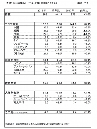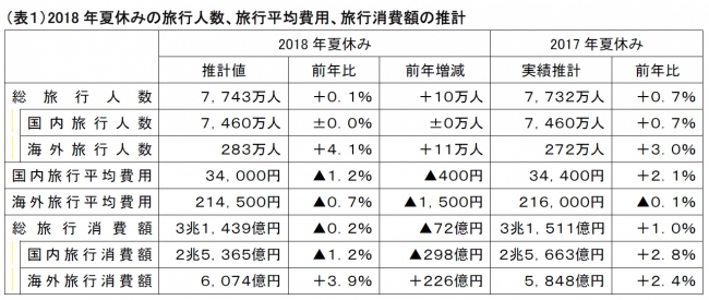 また、近年、アジア各国と日本の都市を結ぶLCC路線が増加したことは訪日外国人だけではなく、日本人の旅行者にも新しい交通手段として選択肢を増やしており、アジア方面は韓国、中国、台湾などの近場アジアが人気で前年比5.5%増加の見込みだ。ハワイ方面はハワイ島の火山噴火の影響が心配されたが、前年比5.0%増加と堅調に推移している。ヨーロッパ方面は東欧諸国やフランスが好調で、前年比2.5%増加する予測。以上からこの夏休み期間中の海外旅行人数は283万人(前年比+4.1%)、一人あたりの旅行平均費用は214,500円(前年比▲0.7%)と推計する。海外旅行人数に関しては、これまで最高だった2012年の276万人を超え、過去最高となる。
