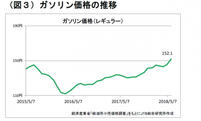 しかしながら、5月の内閣府の景気ウォッチャー指数(注1)は、前月から1.9ポイント減少し、また日経平均株価も7月に入って2か月半ぶりの安値をつけるなどこの先の景気の不透明感はぬぐえない(図1、図2)。4月以降、生活者にとって身近な商品の値上げが続き、特にガソリン代はここ2年上昇が続いている(図3)。前期の企業業績は個人の所得上昇につながったが、物価の上昇や世界経済の不確実性、現実味を帯びてきた来年秋に予定されている消費増税など、今後の生活への消費者の不安は継続するとみられる。