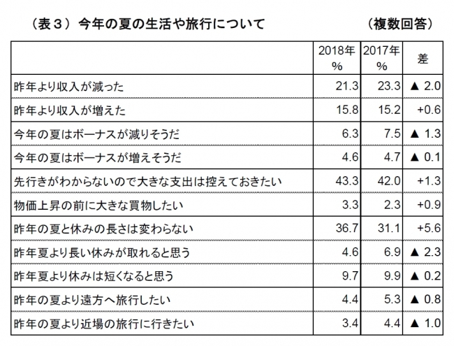同アンケートで今年の夏の生活や旅行について聞いたところ、収入に関しては「昨年より収入が減った」と回答した人は21.3%と前年より2.0ポイント減少し、「昨年より収入が増えた」と回答した人は15.8%と前年より0.6ポイント増加した。ボーナスに関しては「今年の夏はボーナスが減りそうだ」と回答した人は6.3%で前年より1.3ポイント減少している。「今年の夏はボーナスが増えそうだ」は4.6%で前年より0.1ポイントの減少で、減少幅は「減りそうだ」と回答した人より少なくなっている。