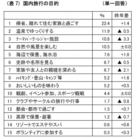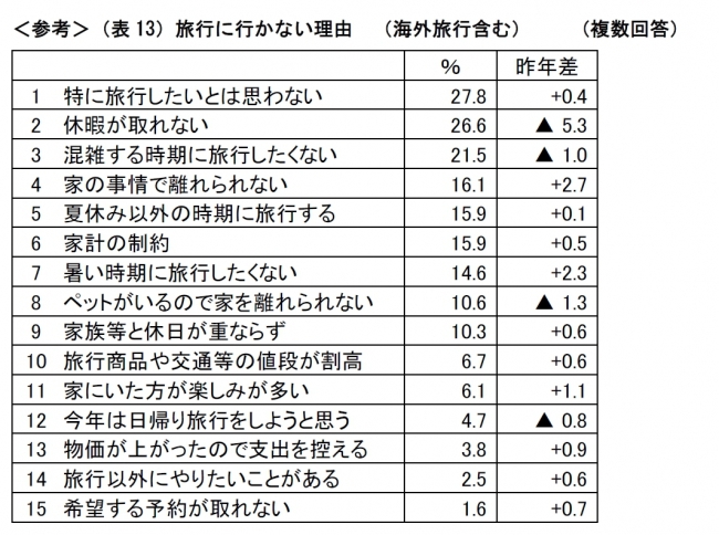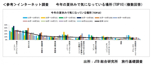 国内旅行先では、沖縄(4.7%)、東北(11.0%)、北陸(5.8%)などが前年より増加している(表12)。JTB総合研究所が行ったインターネット調査で、国内旅行先を選んだ理由を聞いたところ、北海道、東北、中国四国、九州は「帰省先」、北陸、東北は「行きたい旅行先がある」、甲信越、東海は「泊まりたい宿泊施設がある」、関東は「参加したいイベントの開催地」が多くなった。また、同調査で「今年の夏休みで気になっている場所」を聞いたところ、「食をメインにしたイベント」が最も多くなった。夏休みらしく「花火大会」「動物園や水族館」などファミリーが行きやすい場所が人気だ。
