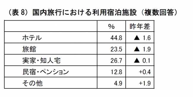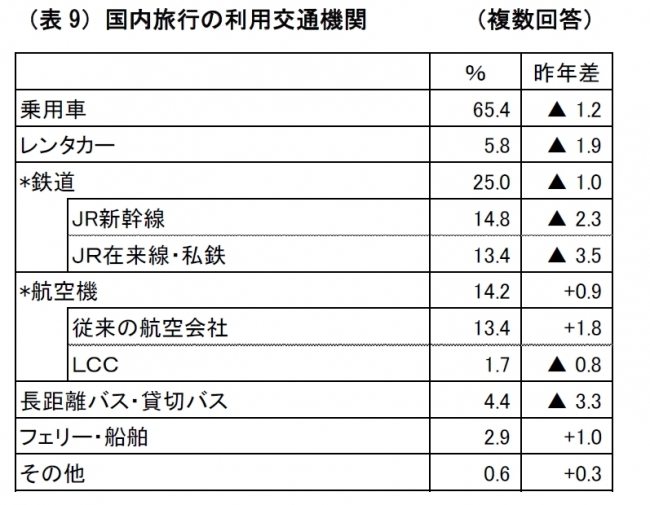 同アンケートでどのような旅行をする予定か聞いたところ、旅行の同行者は「子供づれ(中学生まで)」が36.9%と前年より1.5ポイント増加している(表6)。旅行の目的は「帰省、離れて住む家族と過ごす」が22.4%(前年比+1.4ポイント)と最多だが、「海辺で保養、海水浴」「ハイキング•登山•キャンプ等」も増加している(表7)。宿泊施設は「ホテル」が44.8%(同▲1.6ポイント)、「旅館」が23.5%(同▲1.9ポイント)と前年より減少し、「民宿・ペンション」や、キャンプ場やロッジなどの「その他」が増加した(表8)。利用交通機関では「乗用車」「レンタカー」は減少し、「航空機」は増加となった(表9)。