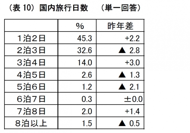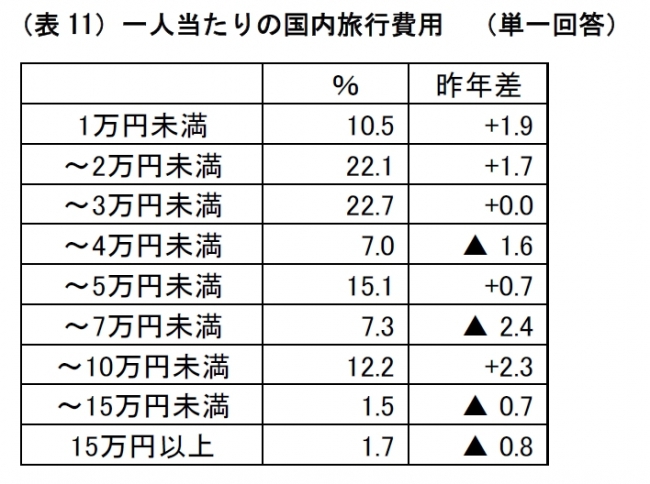 旅行日数は「1泊2日」45.3%(同+2.2ポイント)と「3泊4日」14.0%(同+3.0ポイント)が増加し、「2泊3日」32.6%は前年より2.8ポイント減少した(表10)。一人あたりの旅行費用で多かったのは、2万円未満(22.1%)と3万円未満(22.7%)だ(表11)。以上から今夏は、帰省を兼ねた子供づれの旅行が多そうだ。旅館やホテルの利用が減少し、テーマパーク•レジャー施設も前年から減少していることから、旅行はするが節約したいという気持ちが表れていると思われる。