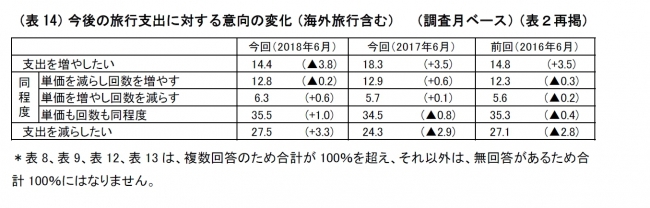 旅行消費に関しても、同社が実施した旅行動向アンケートで「今後の旅行支出に対する意向」を聞いたところ「支出を増やしたい(14.4%)」が前年より3.8ポイント減少し、「支出を減らしたい(27.5%)」は3.3ポイント増加した。「同程度(54.6%)」は1.5ポイント増加し、この先の旅行支出に関しては慎重な様子がうかがえ、手放しで消費に走れない状況であると言えるでしょう(表2)。(注1)タクシー運転手、小売店の店長など景気に敏感な人への調査結果を指数(DI)化したもの