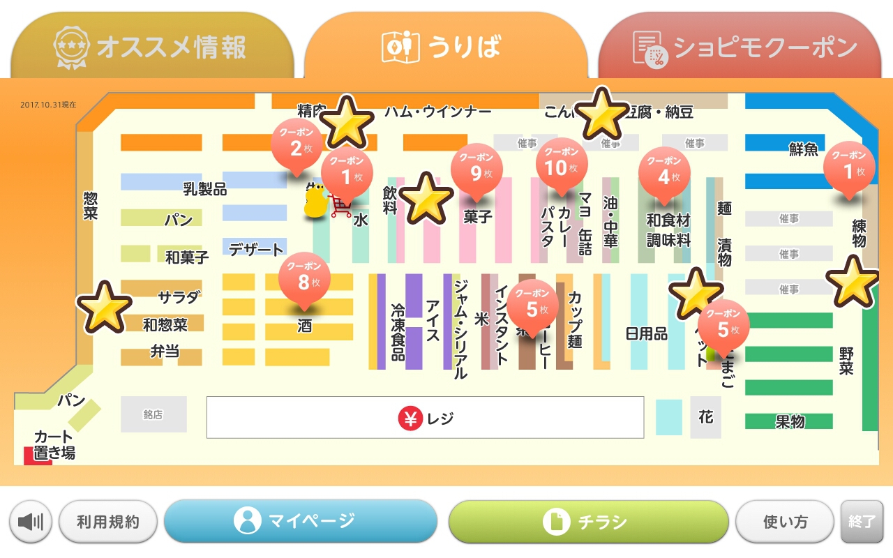 ショッピングカートに取り付けられたタブレット端末を使い、限定クーポンやデジタルスタンプラリーゲームどのコンテンツを店内に設置されたビーコンと連動しながら的確なタイミングでお客様に配信し、より便利で楽しく、お得なお買い物体験を提供する。これまでに全国の累計5小売りチェーンで導入実績がある。