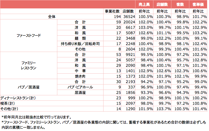 業態別概況ではファーストフード業態の全体売上げは102.0%と前年を上回った 。 「洋風」は季節商品や500円のランチセットなどが好調で、売上げは103.0%。「和風」は鰻の販売が好調で客単価が上昇し、売上げ102.6%。「麺類」はクーポンなどによる集客で客数は前年並みも客単価が下がり、売上げ99.0%。「持ち帰り米飯•回転寿司」は、価格改定による単価上昇などで、売上げは100.4%。「その他」は「アイスクリーム」が猛暑で販売好調、売上げは102.0%となった 。