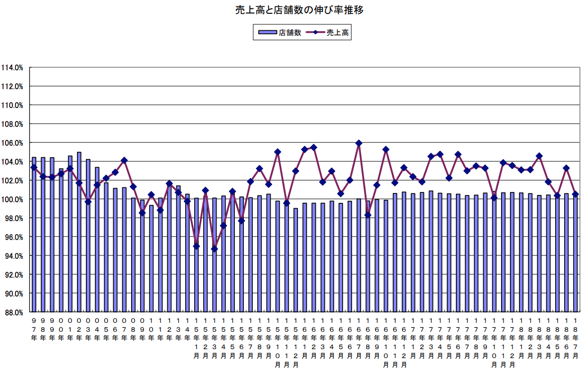 7月の全体概況は土曜日が1日少ない曜日周りに加え、西日本を中心とした豪雨、全国的猛暑、台風など、異例続きの天候で客数は98.9%となったが、価格改定や各社各様のキャンペーン、季節メニューの訴求等により客単価の上昇が続いており、全体売上げは100.5%と、23ヵ月連続して前年を上回った。