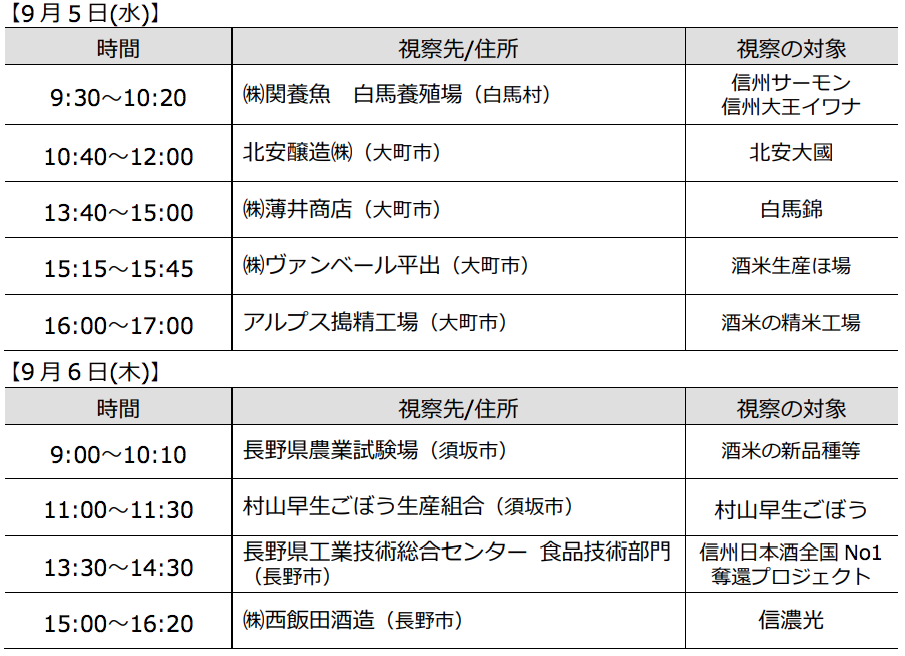 期間は9月5日(水)〜6日(木)、視察する「おいしい信州ふーど」大使はジョン•ゴントナー氏(長野県原産地呼称管理委員会日本酒官能審査委員)。視察先は白馬村、大町市、須坂市、長野市となっている。