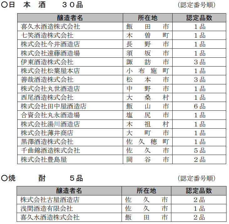 長野県原産地呼称管理制度 新たな日本酒30品、焼酎 5品が認定される! |