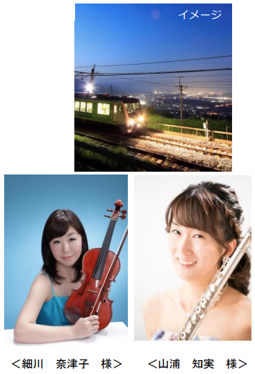 日時•場所は9月22日(土)19:20頃~20:20頃、快速「ナイトビュー姨捨」姨捨駅下りホーム「くつろぎの駅」などで。内容はヴァイオリンとフルートによる管弦二重奏を行う。♪ヴァイオリンは 細川奈津子様、♪フルートは山浦知実様。お二人は長野県の若手芸術家支援事業「next」登録アーティストだ。
