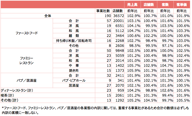8月の全体概況は台風の上陸や集中豪雨、猛暑など、マイナス面もあったが、東京などで長雨の続いた前年と比べると雨天日が少なく、全体の客数は101.0%となった。加えて価格改定や各社各様のキャンペーン、季節メニューの訴求等による客単価の上昇が続いており、全体売上げは102.9%と、24ヵ月連続して前年を上回った。