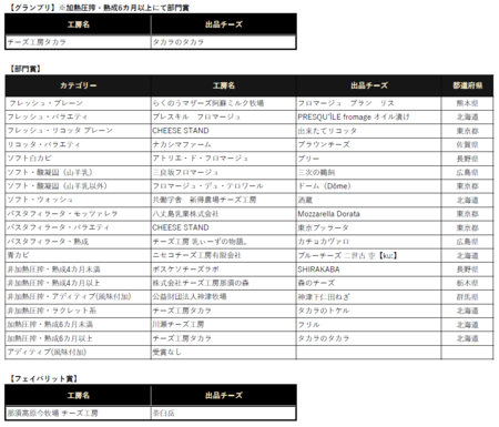 また、「フレッシュ•リコッタ プレーン」「ソフト白カビ」「青カビ」などの各カテゴリで、高い評価を得たチーズの中から選出される「部門賞」には、北海道、栃木県、群馬県、東京都、長野県、広島県、佐賀県、熊本県の計16工房、18品が選ばれた。さらに、フランスに本部を置くギルド•アンテルナショナル•デ•フロマジェ協会副会長のフランソワ・シュミットラン氏による「フェイバリット賞」を、那須高原今牧場チーズ工房の「茶臼岳」が受賞した。