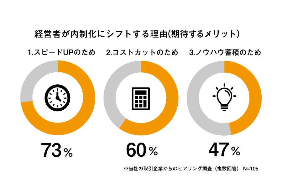 働き方改革が注目される中、制作物を内制し効率化を図る企業が増加している。この流れは飲食企業も同様で、メニュー制作を始めとする販促物は社内デザイナーで賄う傾向にある。飲食店経営者が内制化にシフトする理由(期待するメリット)としては右図の3点が最も多いことが当社のヒアリングから分かった。しかし企業側が内制化に向け積極的な採用を行っても、育成の環境が整っていないために、人材が育たないという課題を内包する企業が多いことも分かりました。