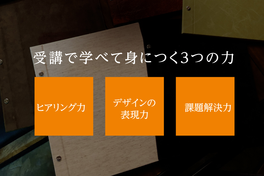 これまでにメニューデザイン研究所が導入してきた10,000店舗以上の実績から得た、メニューデザインのノウハウを習得することで、社内デザイナーに必要な “3つの力” が身につく。