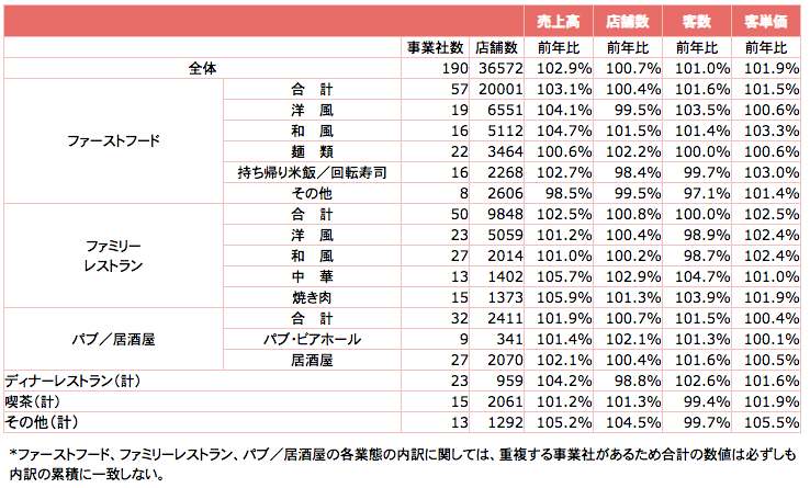 パブ•居酒屋業態では「パブ・ビアホール」は店によって明暗を分けたが、ハッピーアワー拡大等による集客増が支えとなり、売上げ102.0%。「居酒屋」も安定した天候から前年より客数が伸び、売上げは104.1%となった 。 ディナーレストラン業態は割引販売や季節限定フェア、大型の新店効果などにより、売上げは101.9%となった。