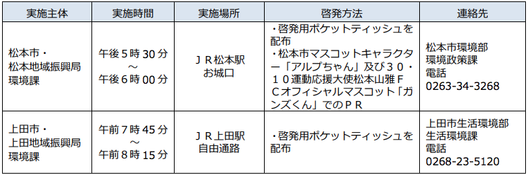内容は長野県PRキャラクター「アルクマ」と一緒にポケットティッシュを配付し、「宴会でのたべきり」を呼び掛ける。当日は「長野市ポイ捨て•歩行喫煙等防止条例」街頭啓発と合同の開始式をJR長野駅善光寺口広場で行う(※雨天の場合、アルクマからのPRは中止することがある)。また、同日に松本市及び上田市においても街頭PR活動を実施する。