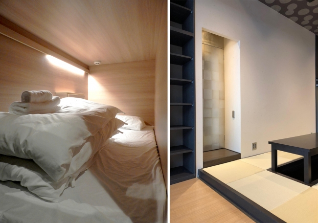 画像左から)ドミトリーベッド内部、エントランスラウンジスペース