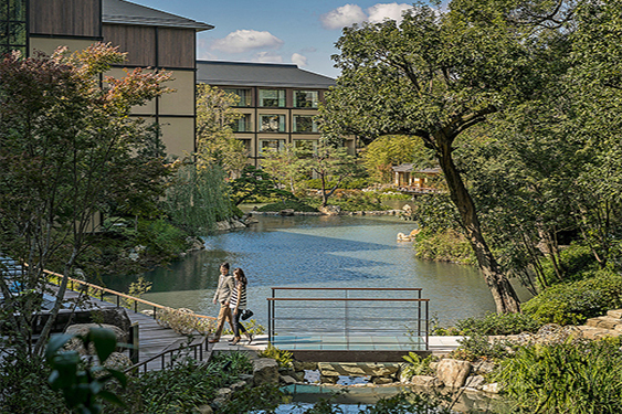 庭園の対岸にある数寄屋づくりの茶室内「楓樹」では、日中は抹茶などを使用したスイーツ、夕暮れ時からはライトアップされた庭園を目前に日本酒やシャンパンをお楽しみいただける。さらにはリゾート気分を満喫できるプールやフィットネス、スパも完備。自然光が差し込むチャペル、そして最大360名の宴会を開催することができるボールルームなどの宴会場施設は、婚礼から会議、各種レセプションまで、用途に応じてご利用いただけるスタイリッシュな空間だ。