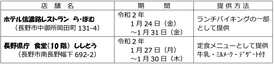 全国学校給食週間(毎年1月24日から1月30日)に合わせて、昔懐かしい給食メニューや現在学校給食で提供されている人気メニューを長野市内の飲食店で召し上がれる。地場産物をふんだんに活用した長野県の学校給食は、全国学校給食甲子園に2年連続で決勝戦まで勝ち残るなど、全国的にも高く評価されている。「この機会に是非ご賞味ください」と関係者は話している。