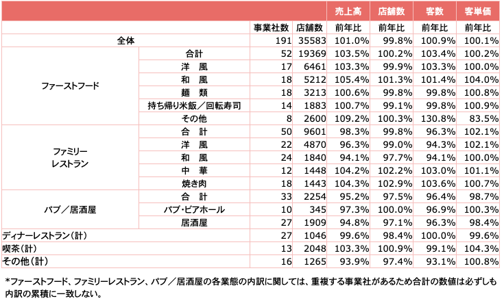 業態別概況ではファーストフード業態の全体売上げは103.5%と前年を上回った。「洋風」は期間限定商品やクリスマスシーズンのチキンが好調で、売上げは103.3%。「和風」は引き続き季節商品や定食メニューの好調で客単価上昇、売上げ105.4%となった。