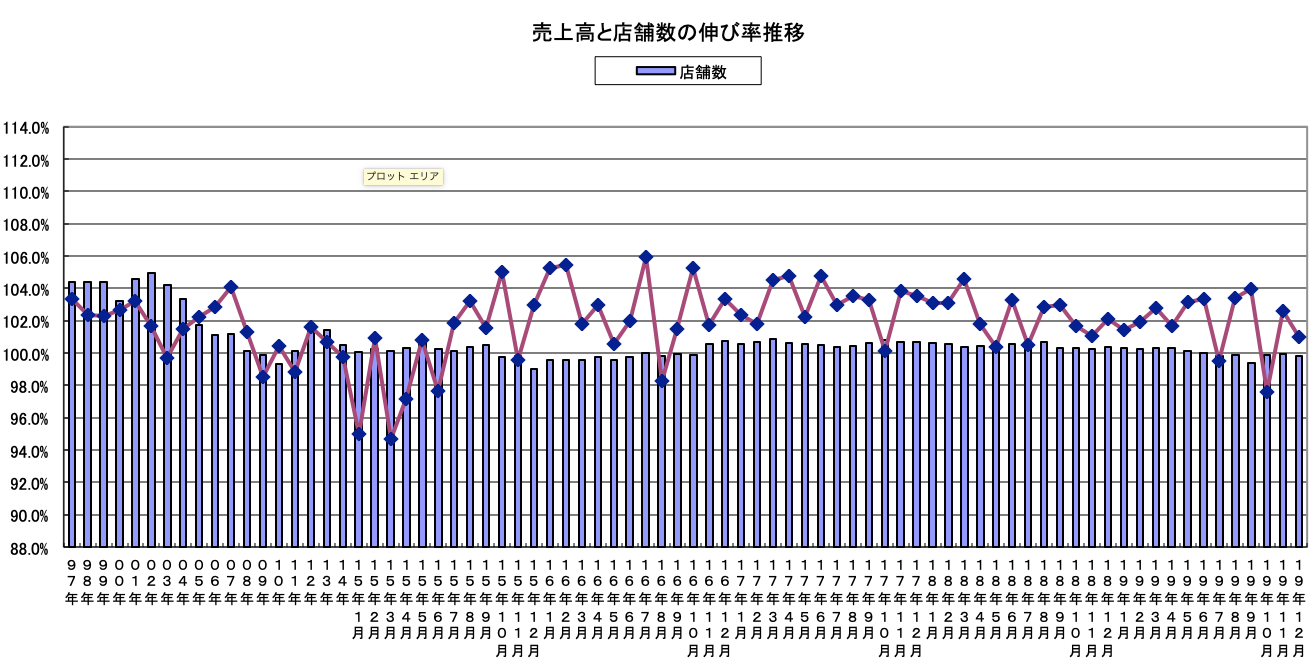 12月の全体概況は、土曜•祝日が前年より少なく、外食全体の客数に影響し、FR業態及び飲酒業態を中心に客数を落とした。また、法人の忘年会の減少、禁煙店舗の増加、大晦日などの営業時間短縮、消費増税の影響による商業施設の不振なども、客数減の要因となったが、引き続き好調なFF業態に支えられ、外食全体の売上げは101.0%と前年を上回った。