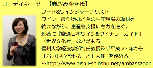 コーディネーターの鹿取みゆき氏(フード&ワインジャーナリスト)。ワイン、農作物など食の生産現場の取材を続けながら、生産者支援にも力を注ぐ。 近著に『厳選日本ワイン&ワイナリーガイド』 (世界文化社)などがある。信州大学経法学部特任教授及び平成27年から「おいしい信州ふーど」大使※を務める(※http://www.oishii-shinshu.net/ambassador)。