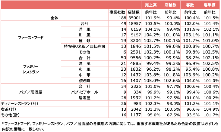 ファミリーレストラン業態の全体売上げは100.2%と前年をわずかに上回った。「洋風」と「和風」は、引き続き禁煙店舗の増加や営業時間短縮により客数減も見られたが、「洋風」の一部では回復傾向の店舗も見られ、売上げは「洋風」99.4%、「和風」96.2%。「中華」は各種キャンペーンやテイクアウト、デリバリーの好調により、売上げは103.8%。「焼き肉」は年始需要の好調と店舗増で、売上げは105.0%となった。