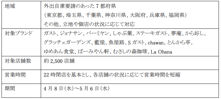 営業継続の対策として、外出自粛要請のあった地域および立地や個店の状況に応じて営業時間を短縮し、ニーズの高まる宅配やテイクアウトの体制を強化する。なお、各ブランドにおいて商品を一部限定して販売するなど運営体制を整備している。