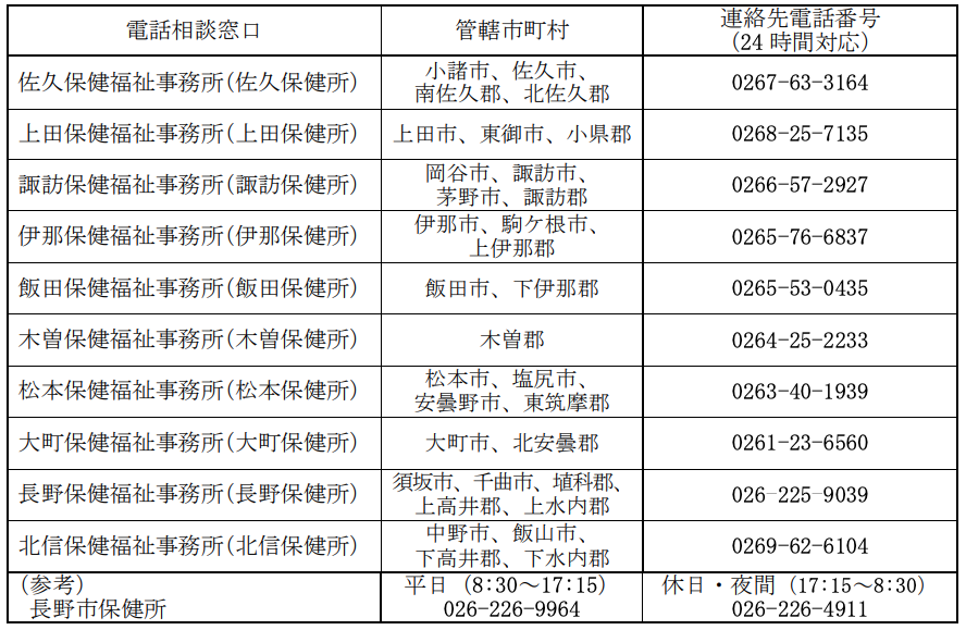この件のお問い合わせは県健康福祉部保健•疾病対策課 (課長)西垣明子 (担当)唐木英司まで(電 話026-235-7148<直通> 026-232-0111<代表>内線2646 FAX026-235-7170 E-mail hoken-shippei@pref.nagano.lg.jp)。
