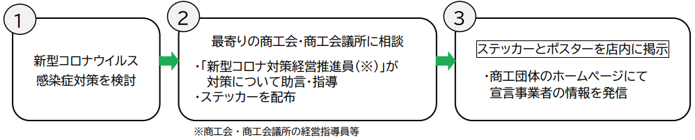“新しい生活様式”に合わせた営業スタイルの促進 「新型コロナ対策推進宣言の店」がスタートに! コロナ対策経営推進員による助言及びステッカーの配布 |