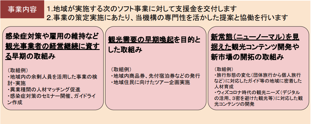 支援対象事業は観光業に携わる上記団体と(一社)長野県観光機構が協働して企画•実施する次の事業に対し支援金を交付する。(1)感染症対策や雇用の維持など観光事業者の経営継続に資する早期の取組(例:異業種間の人材マッチング促進、感染症対策セミナー開催)、(2)観光需要の早期喚起を目的とした取組(例:地域内商品券等の発行、地域住民向けツアー企画実施)、(3)新業態(ニューノーマル)を見据えた観光コンテンツ開発や新市場の開拓を目的とした取組(例:ウィズコロナ時代の観光ニーズ(デジタルの活用等)に対応した観光コンテンツの開発)
