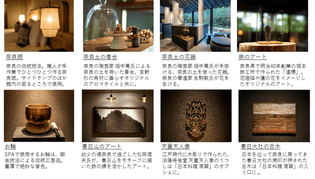 美しい歴史と文化が根付く奈良の地で、それを形どったアートや伝統工芸品が各客室、滴翠、エントランスに飾られている。知るほどに面白く、学ぶほどに奥深い奈良の伝統や職人技を随所で感じていただける。