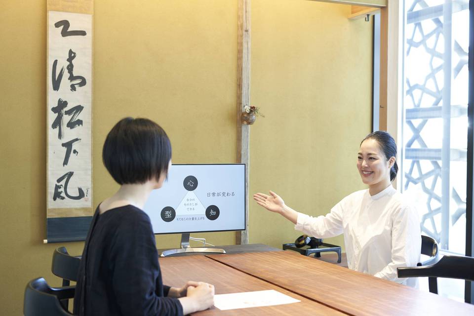 お茶を通しておもてなしの力量を上げる「稽古」。テーブルで私服で初めての方でも気軽に始めることができ、日常の中でお茶を愉しんでいただきたくことができる。「美しい所作を身に着けたい」「美味しくお茶を点てられるようになりたい」お茶を習う目的は人によって様々だ。ゴールを自身で決められるように段階的に設定し、目的に合わせた稽古を受けることが出来る。また6月より新たにオンラインでの稽古もスタートしている。店舗と並行して受講できるため、自宅にいながら隙間時間に愉しめる。