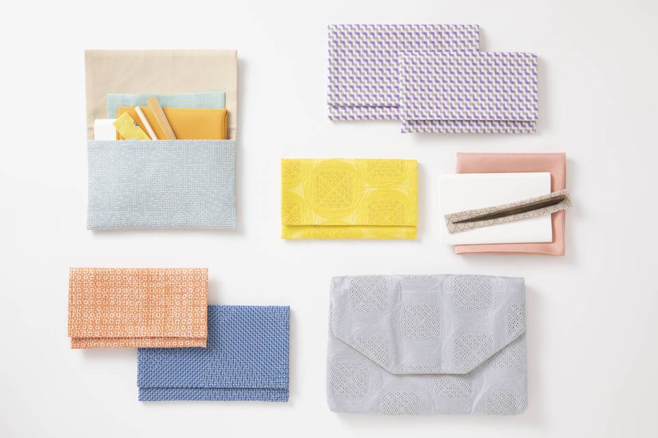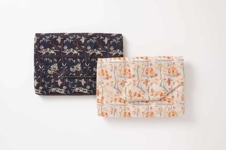 外側のポケット、懐紙や扇⼦を仕分けることができる仕切り板など、便利な機能を備えた数寄屋袋。春⽇⼤社の宝物「国宝⾦地螺鈿⽑抜形太⼑」をモチーフに、京都の先染め織物•⻄陣織で表現したテキスタイルだ(色:白、紺)。