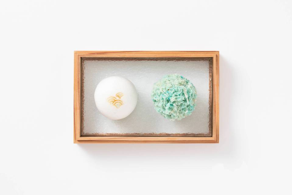 左:銘 「青海波(せいがいは)」青海波とは日本の伝統的な吉兆文様の1つ。穏やかに無限に広がる波の文様に未来へと続く繁栄と末広がりに開けていくという意味を持つ。つくね芋と丹波大納言の赤餡を使った格高い薯蕷饅頭(じょうようまんじゅう)。粒餡をこし餡で包むという丁寧な味のグラデーションとふっくらとした皮で包まれ滑らかな口どけが愉しめる。