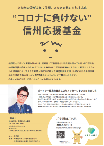 公益財団法人⻑野県みらい基金が、子どもや若者、障がい者、 高齢者など困難を抱える人の支援を行っている県内のNPO法人やボランティア団体などへ助成するために造成した基金だ。ホームページ→https : //www.mirai-kikin.or.jp/donation-program/1058/