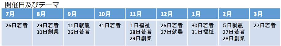 相談テーマ及び対応者は①就農相談(長野県農政部農村振興課)②創業相談(ながの創業サポートオフィス)③福祉の仕事(長野県社会福祉協議会)④若者の就業(ジョブカフェ信州)。※暮らしの案内など専門分野以外の案内、説明はNPO法人ふるさと回帰支援センターの相談員がフォローする。