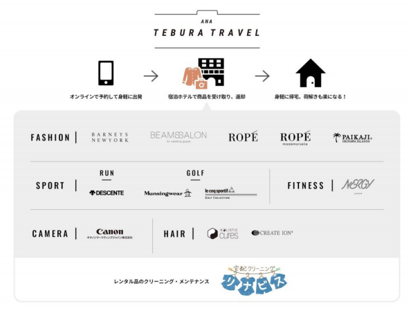 ANAセールス(株)(東京都中央区、高橋誠一代表取締役社長)は、昨年12月に富士通(株)、(株)バーニーズ ジャパン、キヤノンマーケティングジャパン(株)、(株)クレイツ、(株)東田ドライと協業で、 「旅先でもお洒落に過ごしたいけど荷物がかさばる」というお客様の悩みを解消すべく、旅先にあった服や靴、デジタルカメラ、美容家電などのアイテムを、宿泊先のホテルで受け取り•返却できる「ANA TEBURA TRAVEL」サービスの提供を開始した。