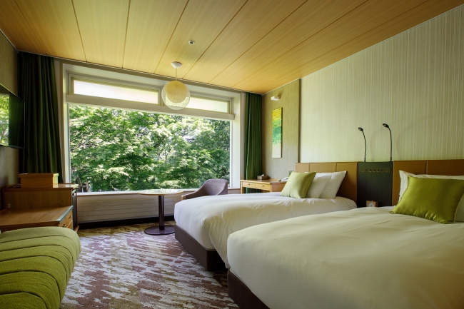 全174室のうち72室が「軽井沢の自然の光」をテーマに、木漏れ日のような柔らかな光をイメージしたカラーデザインの部屋に生まれ変わった。