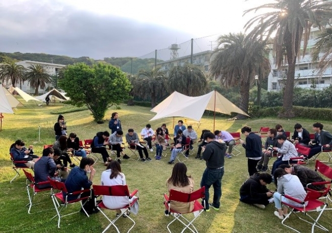 スノーピークのキャンプ用品を使ったアウトドアワークスタイルの提案。組織活性化を支援する「スノーピークビジネスソリューションズ」と、都心から約1時間、三浦半島の南東に位置する「観音崎京急ホテル」との協業により、非日常感溢れるCAMPING OFFICEの設営を実現した。