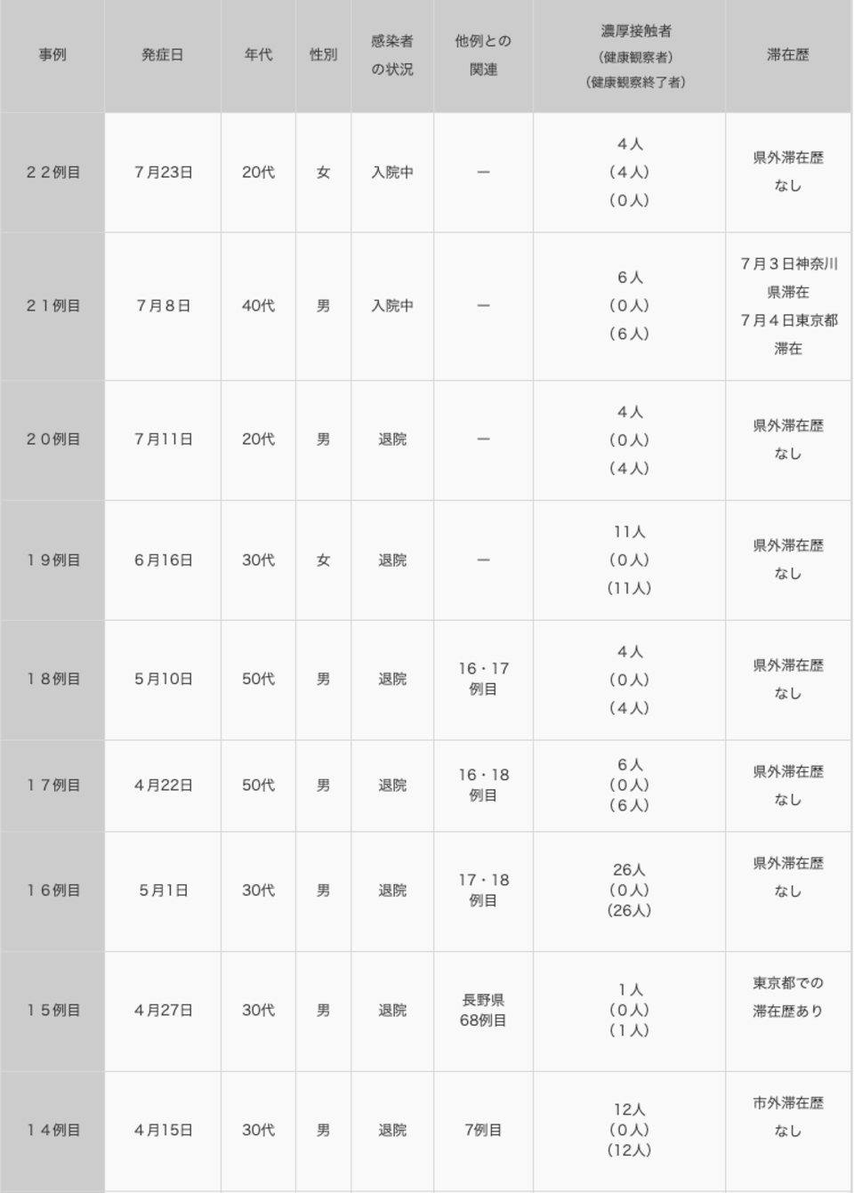 8月1日にPCR検査の結果「陽性」と判明。感染症指定医療機関Cに入院した。感染源に関する行動歴は県外へは出ていないとのことだが、詳細は調査中だ。濃厚接触者は同居者3人、同居者以外の人1人である。