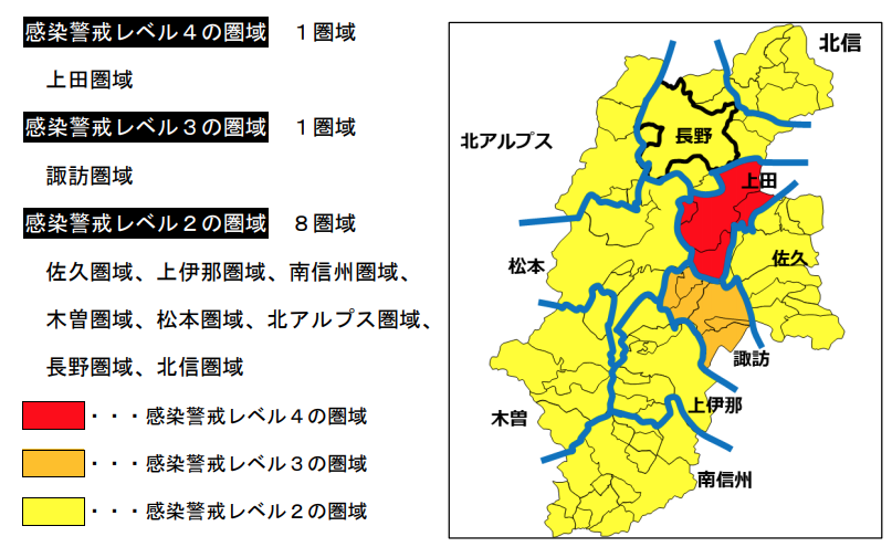 ※長野県にお住いの方、訪問される方、事業者の皆様等におかれましては、「新型コロナウイルス注意報」は依然として発出中であることにご注意いただき、別紙のとおり感染防止策へのご協力を引き続きお願いします。なお、レベルの引上げから14日間経過していないため、諏訪圏域のレベル3と上田圏域のレベル4は継続します。