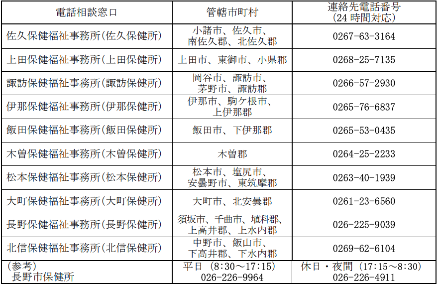 この件のお問い合わせは県健康福祉部 感染症対策課 (課長)原啓明 (担当)伊藤博臣まで(電話 026-235-7378<直通> 026-232-0111<代表>内線2597 FAX026-235-7170