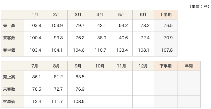 ロイヤルホスト9月の月次売上げ 売上高83.5%、来客数76.9% 客単価108.5%に |