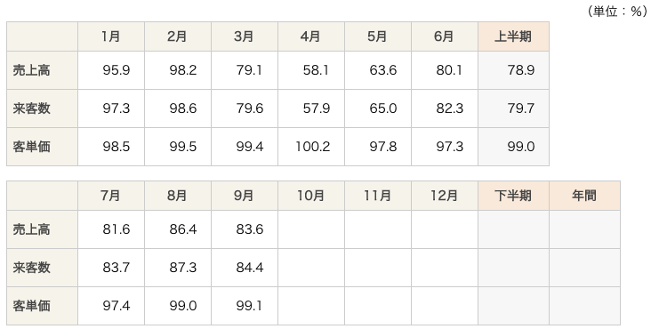 4月以降の数値は新型コロナウイルス感染症の感染拡大による影響で、休業店舗や営業時間短縮店舗及び店内飲食を中止し、お持ち帰り•デリバリー•売店販売のみに限定して営業した店舗も含んでいる。